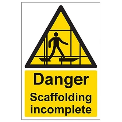 Helps to fulfil legal obligations to inform employees, visitors and the general public of potential hazards as per Health and Safety (Safety Signs & Signals) Regulations 1996 Conforms to EN ISO 7010:2012 - Warning signs feature a triangular symbol with a black pictogram and yellow background occupying at least 50% of the total sign area Portrait Orientation. Sign reads "Danger. Scaffolding Incomplete" Highly durable Self Adhesive Vinyl material and screen printed message will stand the test of time Sign measures 200 x 300mm. Self Adhesive material will adhere securely to most surfaces