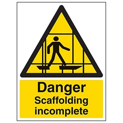 Helps to fulfil legal obligations to inform employees, visitors and the general public of potential hazards as per Health and Safety (Safety Signs & Signals) Regulations 1996 Conforms to EN ISO 7010:2012 - Warning signs feature a triangular symbol with a black pictogram and yellow background occupying at least 50% of the total sign area Portrait Orientation. Sign reads "Danger. Scaffolding Incomplete" Highly durable 1mm plastic material and screen printed message will stand the test of time Sign measures 300 x 400mm.