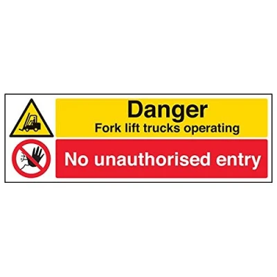 Helps to fulfil legal obligations to inform employees, visitors and the general public of potential hazards as per Health and Safety (Safety Signs & Signals) Regulations 1996 Conforms to EN ISO 7010:2012 - Warning signs feature a triangular symbol with a black pictogram and yellow background occupying at least 50% of the total sign area Landscape Orientation. Sign reads "Danger. Fork Lift Trucks Operating. No Unauthorised Entry" Highly durable 1mm plastic material and screen printed message will stand the test of time Sign measures 450 x 150mm.