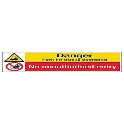 Helps to fulfil legal obligations to inform employees, visitors and the general public of potential hazards as per Health and Safety (Safety Signs & Signals) Regulations 1996 Conforms to EN ISO 7010:2012 - Warning signs feature a triangular symbol with a black pictogram and yellow background occupying at least 50% of the total sign area Landscape Orientation. Sign reads "Danger. Fork Lift Trucks Operating. No Unauthorised Entry" Highly durable Self Adhesive Vinyl material and screen printed message will stand the test of time Sign measures 600 x 200mm. Self Adhesive material will adhere securely to most surfaces