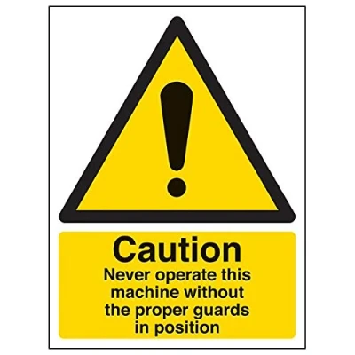 Helps to fulfil legal obligations to inform employees, visitors and the general public of potential hazards as per Health and Safety (Safety Signs & Signals) Regulations 1996 Conforms to EN ISO 7010:2012 - Warning signs feature a triangular symbol with a black pictogram and yellow background occupying at least 50% of the total sign area Portrait Orientation. Sign reads "Caution. Never Operate This Machine Without The Proper Guards In Position" Highly durable 1mm plastic material and screen printed message will stand the test of time Sign measures 150 x 200mm.