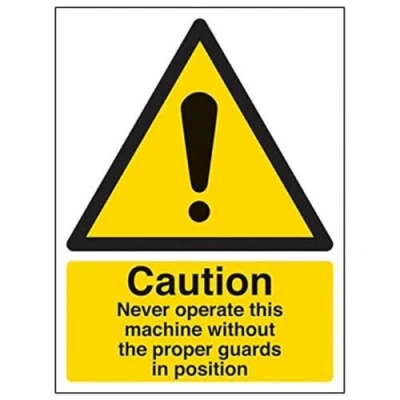 Helps to fulfil legal obligations to inform employees, visitors and the general public of potential hazards as per Health and Safety (Safety Signs & Signals) Regulations 1996 Conforms to EN ISO 7010:2012 - Warning signs feature a triangular symbol with a black pictogram and yellow background occupying at least 50% of the total sign area Portrait Orientation. Sign reads "Caution. Never Operate This Machine Without The Proper Guards In Position" Highly durable Self Adhesive Vinyl material and screen printed message will stand the test of time Sign measures 150 x 200mm. Self Adhesive material will adhere securely to most surfaces