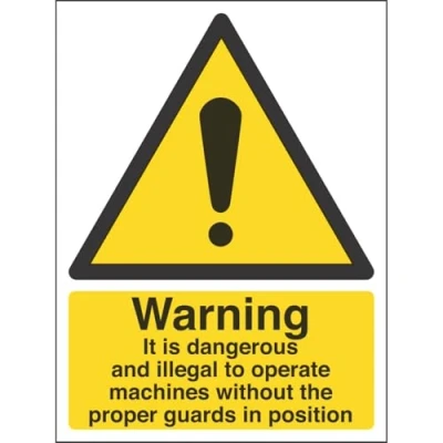 Helps to fulfil legal obligations to inform employees, visitors and the general public of potential hazards as per Health and Safety (Safety Signs & Signals) Regulations 1996 Conforms to EN ISO 7010:2012 - Warning signs feature a triangular symbol with a black pictogram and yellow background occupying at least 50% of the total sign area Portrait Orientation. Sign reads "Warning. It Is Dangerous And Illegal To Operate Machines Without The Proper Guards In Position" Highly durable Self Adhesive Vinyl material and screen printed message will stand the test of time Sign measures 150 x 200mm. Self Adhesive material will adhere securely to most surfaces