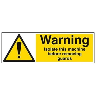 Helps to fulfil legal obligations to inform employees, visitors and the general public of potential hazards as per Health and Safety (Safety Signs & Signals) Regulations 1996 Conforms to EN ISO 7010:2012 - Warning signs feature a triangular symbol with a black pictogram and yellow background occupying at least 50% of the total sign area Landscape Orientation. Sign reads "Warning. Isolate This Machine Before Removing Guards" Highly durable Self Adhesive Vinyl material and screen printed message will stand the test of time Sign measures 600 x 200mm. Self Adhesive material will adhere securely to most surfaces