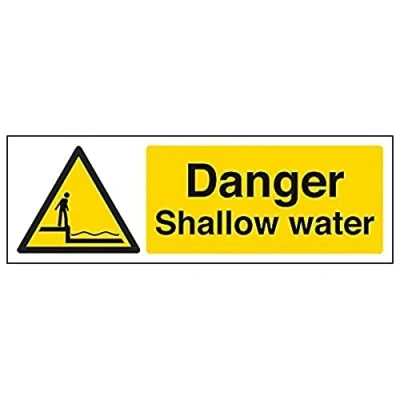 Ideal for use in kitchens and toilets to highlight any sources of hot water which could scald or injure Conforms to EN ISO 7010:2012 - Warning signs feature a triangular symbol with a black pictogram and yellow background occupying at least 50% of the total sign area Landscape Orientation. Sign reads "Danger. Shallow Water" Highly durable Self Adhesive Vinyl material and screen printed message will stand the test of time Sign measures 300 x 100mm. Self Adhesive material will adhere securely to most surfaces