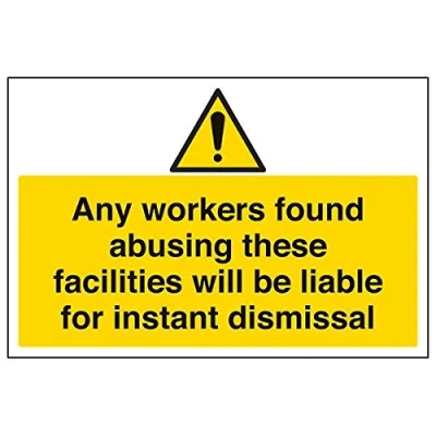 Helps to fulfil legal obligations to inform employees, visitors and the general public of potential hazards as per Health and Safety (Safety Signs & Signals) Regulations 1996 Conforms to EN ISO 7010:2012 - Warning signs feature a triangular symbol with a black pictogram and yellow background occupying at least 50% of the total sign area Landscape Orientation. Sign reads "Any Workers Found Abusing These Facilities Will Be Liable For Instant Dismissal." Highly durable 1mm plastic material and screen printed message will stand the test of time Sign measures 300 x 200mm.