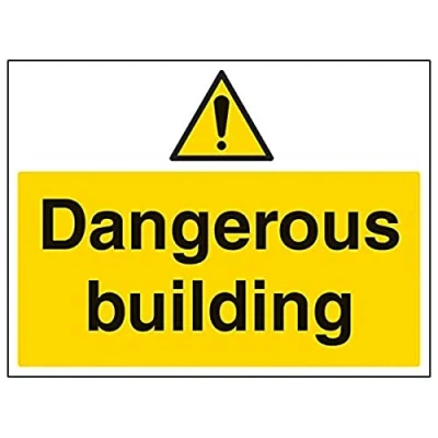 Helps to fulfil legal obligations to inform employees, visitors and the general public of potential hazards as per Health and Safety (Safety Signs & Signals) Regulations 1996 Conforms to EN ISO 7010:2012 - Warning signs feature a triangular symbol with a black pictogram and yellow background occupying at least 50% of the total sign area Landscape Orientation. Sign reads "Dangerous Building" Highly durable Self Adhesive Vinyl material and screen printed message will stand the test of time Sign measures 400 x 300mm. Self Adhesive material will adhere securely to most surfaces