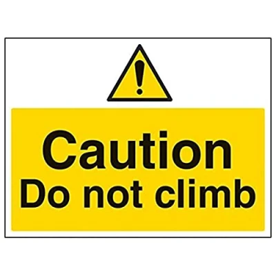 Helps to fulfil legal obligations to inform employees, visitors and the general public of potential hazards as per Health and Safety (Safety Signs & Signals) Regulations 1996 Conforms to EN ISO 7010:2012 - Warning signs feature a triangular symbol with a black pictogram and yellow background occupying at least 50% of the total sign area Landscape Orientation. Sign reads "Caution. Do Not Climb" Highly durable Self Adhesive Vinyl material and screen printed message will stand the test of time Sign measures 400 x 300mm. Self Adhesive material will adhere securely to most surfaces