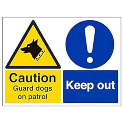 Helps to fulfil legal obligations to inform employees, visitors and the general public of potential hazards as per Health and Safety (Safety Signs & Signals) Regulations 1996 Conforms to EN ISO 7010:2012 - Warning signs feature a triangular symbol with a black pictogram and yellow background occupying at least 50% of the total sign area Landscape Orientation. Sign reads "Caution. Guard Dogs On Patrol. Keep Out" Highly durable Self Adhesive Vinyl material and screen printed message will stand the test of time Sign measures 400 x 300mm. Self Adhesive material will adhere securely to most surfaces