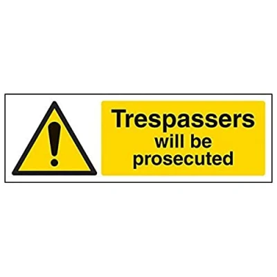 Helps to fulfil legal obligations to inform employees, visitors and the general public of potential hazards as per Health and Safety (Safety Signs & Signals) Regulations 1996 Conforms to EN ISO 7010:2012 - Warning signs feature a triangular symbol with a black pictogram and yellow background occupying at least 50% of the total sign area Landscape Orientation. Sign reads "Trespassers Will Be Prosecuted" Highly durable Self Adhesive Vinyl material and screen printed message will stand the test of time Sign measures 300 x 100mm. Self Adhesive material will adhere securely to most surfaces