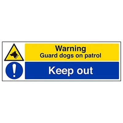 Helps to fulfil legal obligations to inform employees, visitors and the general public of potential hazards as per Health and Safety (Safety Signs & Signals) Regulations 1996 Conforms to EN ISO 7010:2012 - Warning signs feature a triangular symbol with a black pictogram and yellow background occupying at least 50% of the total sign area Landscape Orientation. Sign reads "Warning. Guard Dogs On Patrol. Keep Out" Highly durable 1mm plastic material and screen printed message will stand the test of time Sign measures 600 x 200mm.