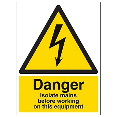 Helps to fulfil legal obligations to inform employees, visitors and the general public of potential hazards as per Health and Safety (Safety Signs & Signals) Regulations 1996 Conforms to EN ISO 7010:2012 - Warning signs feature a triangular symbol with a black pictogram and yellow background occupying at least 50% of the total sign area Portrait Orientation. Sign reads "Danger. Isolate Mains Before Working On This Equipment" Highly durable Self Adhesive Vinyl material and screen printed message will stand the test of time Sign measures 300 x 400mm. Self Adhesive material will adhere securely to most surfaces