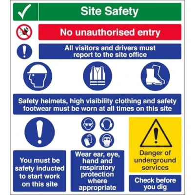Helps to fulfil legal obligations to inform employees, visitors and the general public of potential hazards as per Health and Safety (Safety Signs & Signals) Regulations 1996 Conforms to EN ISO 7010:2012 - Warning signs feature a triangular symbol with a black pictogram and yellow background occupying at least 50% of the total sign area Portrait Orientation. Sign reads "Site Safety. No Unauthorised Entry. All Visitors And Drivers Must Report To The Site Office" Highly durable 1mm plastic material and screen printed message will stand the test of time Sign measures 600 x 670mm.