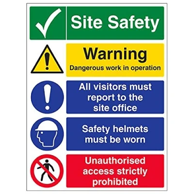Helps to fulfil legal obligations to inform employees, visitors and the general public of potential hazards as per Health and Safety (Safety Signs & Signals) Regulations 1996 Conforms to EN ISO 7010:2012 - Warning signs feature a triangular symbol with a black pictogram and yellow background occupying at least 50% of the total sign area Portrait Orientation. Sign reads "Site Safety. Warning. Dangerous Work In Operation. All Visitors Must Report To The Site Office. Safety Helmets Must Be Worn" Highly durable 1mm plastic material and screen printed message will stand the test of time Sign measures 450 x 600mm.
