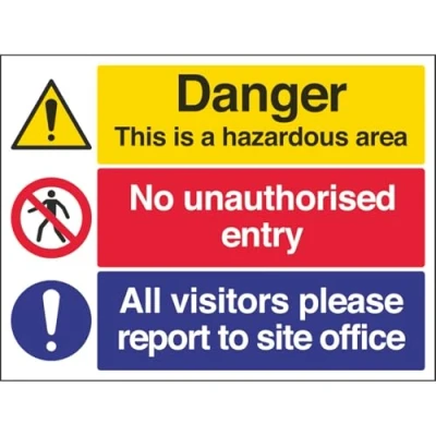 Helps to fulfil legal obligations to inform employees, visitors and the general public of potential hazards as per Health and Safety (Safety Signs & Signals) Regulations 1996 Conforms to EN ISO 7010:2012 - Warning signs feature a triangular symbol with a black pictogram and yellow background occupying at least 50% of the total sign area Landscape Orientation. Sign reads "Danger. This Is A Hazardous Area. No Unauthorised Entry. All Visitors Please Report To Site Office" Highly durable Self Adhesive Vinyl material and screen printed message will stand the test of time Sign measures 400 x 300mm. Self Adhesive material will adhere securely to most surfaces