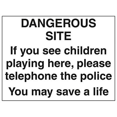 Helps to fulfil legal obligations to inform employees, visitors and the general public of potential hazards as per Health and Safety (Safety Signs & Signals) Regulations 1996 Conforms to EN ISO 7010:2012 - Warning signs feature a triangular symbol with a black pictogram and yellow background occupying at least 50% of the total sign area Landscape Orientation. Sign reads "Dangerous Site. If You See Children Playing Here, Please Telephone The Police. You May Save A Life" Highly durable 1mm plastic material and screen printed message will stand the test of time Sign measures 600 x 450mm.