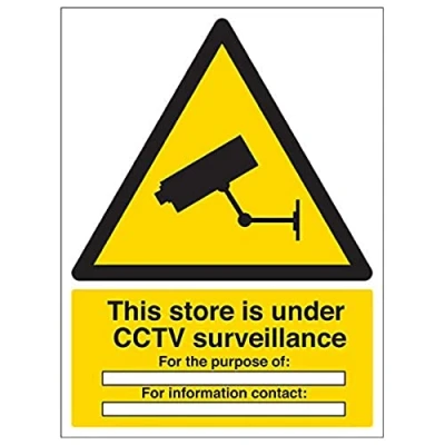 Helps to fulfil legal obligations to inform employees, visitors and the general public of potential hazards as per Health and Safety (Safety Signs & Signals) Regulations 1996 Conforms to EN ISO 7010:2012 - Warning signs feature a triangular symbol with a black pictogram and yellow background occupying at least 50% of the total sign area Portrait Orientation. Sign reads "This Store Is Under CCTV Surveillance. For The Purpose Of. For Information Contact" Highly durable Self Adhesive Vinyl material and screen printed message will stand the test of time Sign measures 300 x 400mm. Self Adhesive material will adhere securely to most surfaces