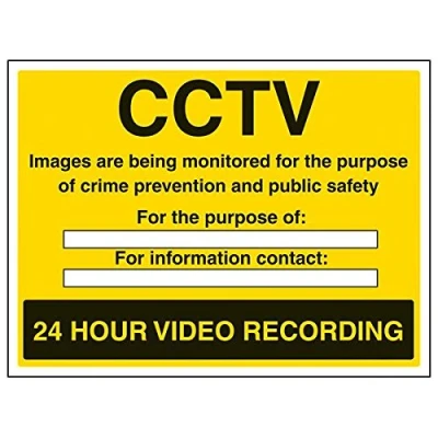 Helps to fulfil legal obligations to inform employees, visitors and the general public of potential hazards as per Health and Safety (Safety Signs & Signals) Regulations 1996 Conforms to EN ISO 7010:2012 - Warning signs feature a triangular symbol with a black pictogram and yellow background occupying at least 50% of the total sign area Landscape Orientation. Sign reads "CCTV Images Are Being Monitored For The Purpose Of Crime Prevention And Public Safety. For The Purpose Of. For Information Contact. 24 Hour Video Recording" Highly durable 1mm plastic material and screen printed message will stand the test of time Sign measures 400 x 300mm.