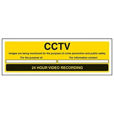 Helps to fulfil legal obligations to inform employees, visitors and the general public of potential hazards as per Health and Safety (Safety Signs & Signals) Regulations 1996 Conforms to EN ISO 7010:2012 - Warning signs feature a triangular symbol with a black pictogram and yellow background occupying at least 50% of the total sign area Landscape Orientation. Sign reads "CCTV Images Are Being Monitored For The Purpose Of Crime Prevention And Public Safety. For The Purpose Of. For Information Contact. 24 Hour Video Recording" Highly durable Self Adhesive Vinyl material and screen printed message will stand the test of time Sign measures 300 x 100mm. Self Adhesive material will adhere securely to most surfaces