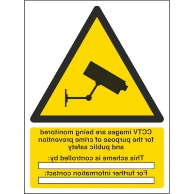 Helps to fulfil legal obligations to inform employees, visitors and the general public of potential hazards as per Health and Safety (Safety Signs & Signals) Regulations 1996 Conforms to EN ISO 7010:2012 - Warning signs feature a triangular symbol with a black pictogram and yellow background occupying at least 50% of the total sign area Portrait Orientation. Sign reads "CCTV Images Are Being Monitored For The Purpose Of Crime Prevention And Public Safety. This Scheme Is Controlled By. For Further Information Contact" Highly durable Window Sticker material and screen printed message will stand the test of time