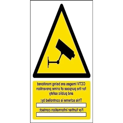 Helps to fulfil legal obligations to inform employees, visitors and the general public of potential hazards as per Health and Safety (Safety Signs & Signals) Regulations 1996 Conforms to EN ISO 7010:2012 - Warning signs feature a triangular symbol with a black pictogram and yellow background occupying at least 50% of the total sign area Portrait Orientation. Sign reads "CCTV Images Are Being Monitored For The Purpose Of Crime Prevention And Public Safety. This Scheme Is Controlled By. For Further Information Contact" Highly durable Window Sticker material and screen printed message will stand the test of time