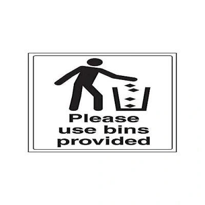 Clearly displays easily understood message, can be used in a number of locations, as per Health and Safety (Safety Signs & Signals) Regulations 1996 Conforms to EN ISO 7010:2012 Portrait Orientation. Sign reads "Please Use Bins Provided" Highly durable 1mm plastic material and screen printed message will stand the test of time Sign measures 300 x 400mm.