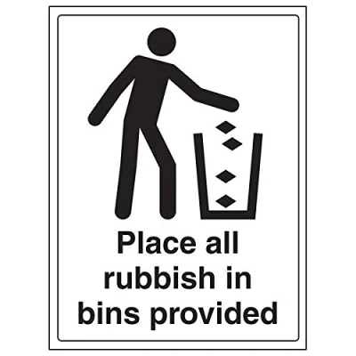 Clearly displays easily understood message, can be used in a number of locations, as per Health and Safety (Safety Signs & Signals) Regulations 1996 Conforms to EN ISO 7010:2012 Portrait Orientation. Sign reads "Place All Rubbish In Bins Provided" Highly durable 1mm plastic material and screen printed message will stand the test of time Sign measures 300 x 400mm.