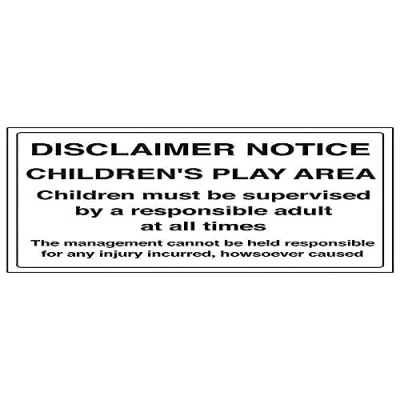 Clearly displays easily understood message, can be used in a number of locations, as per Health and Safety (Safety Signs & Signals) Regulations 1996 Conforms to EN ISO 7010:2012 Landscape Orientation. Sign reads "Disclaimer Notice. Children's Play Area. Children Must Be Supervised By A Responsible Adult. The Management Cannot Be Held Responsible For Any Injury Incurred." Highly durable Self Adhesive Vinyl material and screen printed message will stand the test of time Sign measures 400 x 300mm. Self Adhesive material will adhere securely to most surfaces