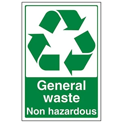 Clearly displays easily understood message, can be used in a number of locations, as per Health and Safety (Safety Signs & Signals) Regulations 2000 Conforms to EN ISO 7010:2012 Portrait Orientation. Sign reads "General Waste Non Hazardous" Highly durable Self Adhesive Vinyl material and screen printed message will stand the test of time Sign measures 200 x 300mm. Self Adhesive material will adhere securely to most surfaces