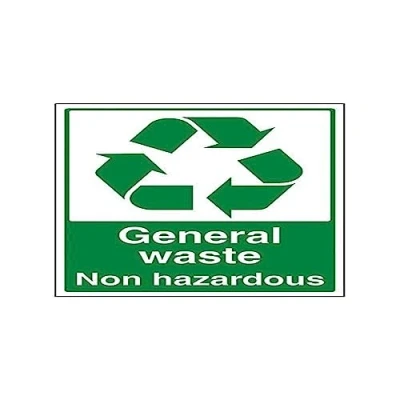 Clearly displays easily understood message, can be used in a number of locations, as per Health and Safety (Safety Signs & Signals) Regulations 2001 Conforms to EN ISO 7010:2012 Portrait Orientation. Sign reads "General Waste Non Hazardous" Highly durable 1mm plastic material and screen printed message will stand the test of time Sign measures 300 x 400mm.