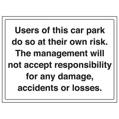 Helps to fulfil legal obligations to advise the public of actions or restrictions concerning parking, as per Health and Safety (Safety Signs & Signals) Regulations 1996 Conforms to EN ISO 7010:2012 Landscape Orientation. Sign reads "Users Of Car Park Do So At Their Own Risk. The Management Will Not Accept Responsibility For Any Damage, Accidents Or Losses." Highly durable Self Adhesive Vinyl material and screen printed message will stand the test of time Sign measures 400 x 300mm. Self Adhesive material will adhere securely to most surfaces