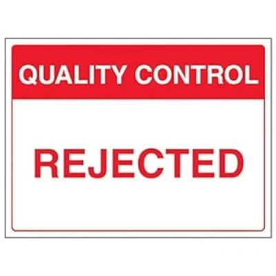 Communicates relevant quality control measures on your site to employees Conforms to EN ISO 7010:2012 Landscape Orientation. Sign reads "Quality Control. Rejected" Highly durable Self Adhesive Vinyl material and screen printed message will stand the test of time Sign measures 400 x 300mm. Self Adhesive material will adhere securely to most surfaces