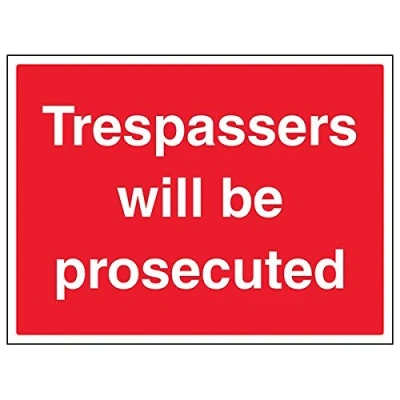 Provides essential information of the dangers on private properties to ensure personal safety as per Health and Safety (Safety Signs & Signals) Regulations 1996 Conforms to EN ISO 7010:2012 Landscape Orientation. Sign reads "Trespassers Will Be Prosecuted" Highly durable 1mm plastic material and screen printed message will stand the test of time Sign measures 400 x 300mm.