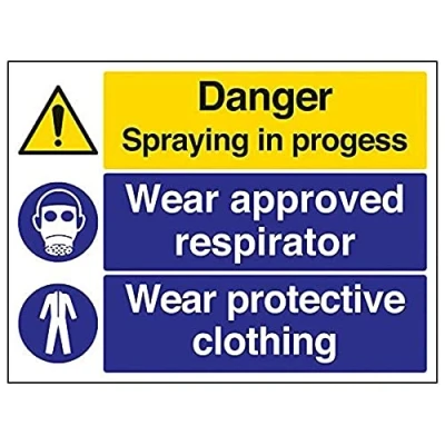 Help to keep staff safe by informing of high risk areas and safe working procedures. Conforms to EN ISO 7010:2012 Landscape Orientation. Sign reads "Danger. Spraying In Progress. Wear Approved Respirator. Wear Protective Clothing" Highly durable 1mm plastic material and screen printed message will stand the test of time Sign measures 400 x 300mm.