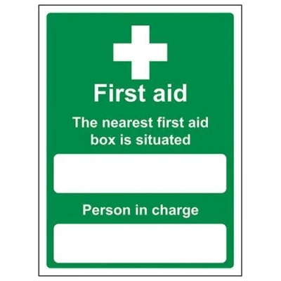 Helps to fulfil obligations to inform of where first aid supplies are kept as per First Aid At Work Regulations, as well as Health and Safety (Safety Signs & Signals) Regulations 1996 Conforms to EN ISO 7010:2012 Portrait Orientation. Sign reads "The Nearest First Aid Box Is Situated. Person In Charge" Highly durable and heavy duty 2mm rigid plastic material Sign measures 200 x 300mm
