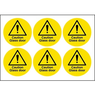 VSafety Caution Glass Door Sign Sheet of 6 Labels 100mm Dia Self Adhesive Vinyl