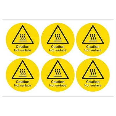 VSafety Caution Hot Surface Sign Sheet of 6 Labels 65mm Dia Self Adhesive Vinyl