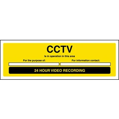 Helps to fulfil legal obligations to inform employees, visitors and the general public of potential hazards as per Health and Safety (Safety Signs & Signals) Regulations 1996 Conforms to EN ISO 7010:2012 - Warning signs feature a triangular symbol with a black pictogram and yellow background occupying at least 50% of the total sign area Landscape Orientation. Sign reads "CCTV Is In Operation In This Area. For The Purpose Of. For Information Contact. 24 Hour Video Recording" Highly durable Self Adhesive Vinyl material and screen printed message will stand the test of time Sign measures 450 x 150mm. Self Adhesive material will adhere securely to most surfaces