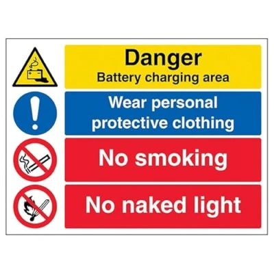 VSafety Danger Battery/PPE/No Smoking/No Naked Light 800x600mm 3mm Aluminium Composite With Anti Graffiti Coating & Fixing Channel Safety Sign
