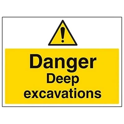 Helps to fulfil legal obligations to inform employees, visitors and the general public of potential hazards as per Health and Safety (Safety Signs & Signals) Regulations 2071 Conforms to EN ISO 7010: 2012 - Warning signs feature a triangular symbol with a black pictogram and yellow background occupying at least 50% of the total sign area Landscape Orientation. Sign reads "Danger. Deep Excavations" Printed on strong 2mm thick white High Impact Polystyrene (HIPS) plastic - ideal for outdoor use