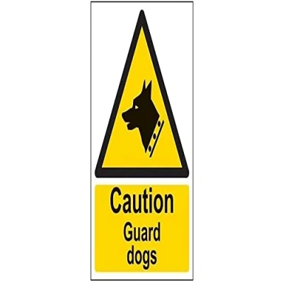 Helps to fulfil legal obligations to inform employees, visitors and the general public of potential hazards as per Health and Safety (Safety Signs & Signals) Regulations 1996 Conforms to EN ISO 7010:2012 - Warning signs feature a triangular symbol with a black pictogram and yellow background occupying at least 50% of the total sign area Portrait Orientation. Sign reads "Caution. Guard Dogs" Highly durable Self Adhesive Vinyl material and screen printed message will stand the test of time Sign measures 150 x 200mm. Self Adhesive material will adhere securely to most surfaces