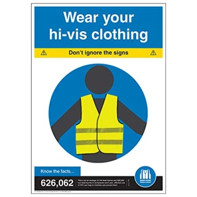 According to the HSE, 609,000 injuries and 144 fatalities occur in UK workplaces every year, protect employees and visitors by helping to avoid accidents Lightweight design allows poster to be easily attached to walls and repositioned whenever necessary Ideal for displaying in workplaces such as first aid rooms, workshops, offices and warehouses Printed directly on to polypropylene, producing high image quality Safety posters promote the use of hi-vis clothing where needed