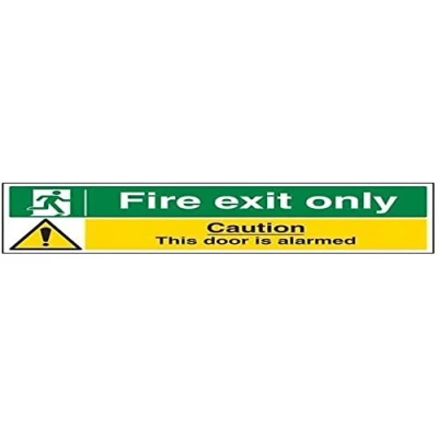 Helps to fulfil obligations to identify escape routes in a fire emergency for all members of staff and visitors as per Health and Safety (Safety Signs & Signals) Regulations 1996 Conforms to EN ISO 7010:2012 by featuring a green background with a white pictogram or text positioned centrally Landscape Orientation. Sign reads "Fire Exit Only. Door Alarmed" Highly durable Self Adhesive Vinyl material and screen printed message will stand the test of time Sign measures 600 x 200mm. Self Adhesive material will adhere securely to most surfaces