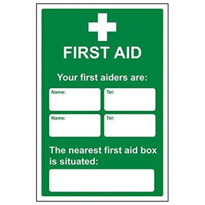 Helps to fulfil obligations to inform of where first aid supplies are kept as per First Aid At Work Regulations, as well as Health and Safety (Safety Signs & Signals) Regulations 1996 Conforms to EN ISO 7010:2012 Portrait Orientation. Sign reads "First Aid. Your First Aiders Are: The Nearest First Aid Box Is Situated:" Highly durable and heavy duty 2mm rigid plastic material Sign measures 300 x 400mm