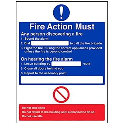 Provides essential information regarding action to be taken in the event of a fire Conforms to EN ISO 7010:2012 Portrait Orientation. Sign reads "Fire Action. Any Person Discovering A Fire..." Highly durable Self Adhesive Vinyl material and screen printed message will stand the test of time Sign measures 300 x 400mm. Self Adhesive material will adhere securely to most surfaces