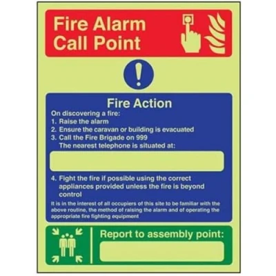 Provides essential information regarding action to be taken in the event of a fire Conforms to EN ISO 7010:2012 Portrait Orientation. Sign reads "Fire Alarm Call Point. Fire Action. On Discovering A Fire: Raise The Alarm. Ensure The Caravan Or Building Is Evacuated. Report To Assembly point" Highly durable Glow In The Dark Self Adhesive Vinyl and screen printed message will stand the test of time Sign measures 150 x 200mm. Self Adhesive material will adhere securely to most surfaces