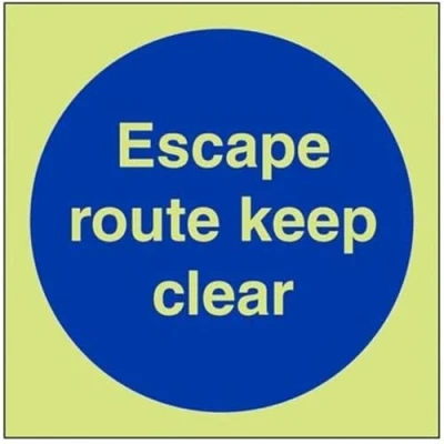 Helps to fulfil obligations to show vital escape route information about fire doors for all employees and visitors as per Health and Safety (Safety Signs & Signals) Regulations 1996 Conforms to EN ISO 7010:2012 Square Orientation. Sign reads "Escape Route Keep Clear" Highly durable Glow In The Dark Self Adhesive Vinyl and screen printed message will stand the test of time Sign measures 100 x 100mm. Self Adhesive material will adhere securely to most surfaces