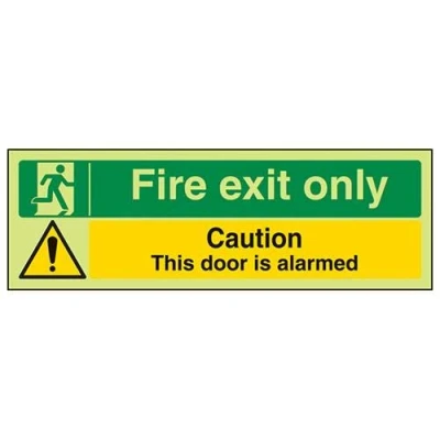 Helps to fulfil obligations to identify escape routes in a fire emergency for all members of staff and visitors as per Health and Safety (Safety Signs & Signals) Regulations 1996 Conforms to EN ISO 7010:2012 by featuring a green background with a white pictogram or text positioned centrally Landscape Orientation. Sign reads "Fire Exit Only. Caution. This Door Is Alarmed" Highly durable Glow In The Dark Self Adhesive Vinyl and screen printed message will stand the test of time Sign measures 600 x 200mm. Self Adhesive material will adhere securely to most surfaces