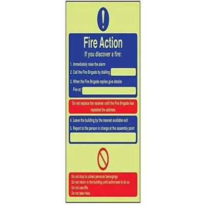 Provides essential information regarding action to be taken in the event of a fire Conforms to EN ISO 7010:2012 Portrait Orientation. Sign reads "Fire Action. If You Discover A Fire: Immediately Raise The Alarm. Call The Fire Brigade. When The Fire Brigade Replies Give Details" Highly durable Glow In The Dark Self Adhesive Vinyl and screen printed message will stand the test of time Sign measures 150 x 200mm. Self Adhesive material will adhere securely to most surfaces