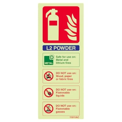 VSafety Glow In The Dark L2 Powder Id Fire Extinguisher Sign 75mm x 200mm Self Adhesive Vinyl